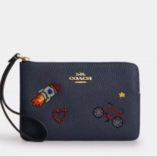 • NWT Coach Leather Corner Zip Wristlet Wallet with Embellishments In Gold/Denim