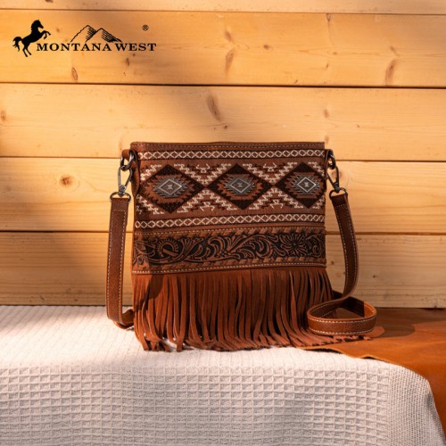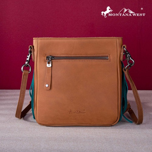 Montana West Genuine Leather Tooled Collection Fringe Crossbody