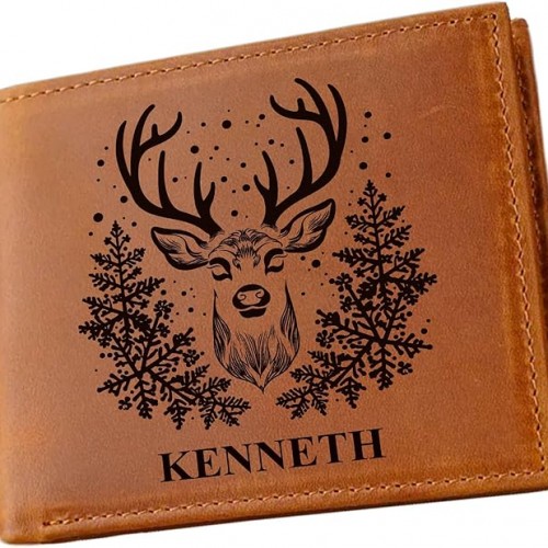 Personalized Deer Engraved Leather Wallet for Men – Custom Name Leather Bifold – RFID Blocking Christmas Themed Wallet – Gift for Dad, Husband, Boyfriend, or Outdoorsman