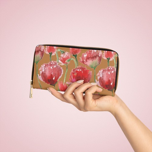 Beige Red Tulips Zipper Wallet, Red Tulips Flower Print Best Long Compact Wallet For Women
