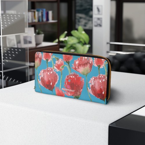 Blue Red Tulips Zipper Wallet, Red Tulips Flower Print Best Long Compact Wallet For Women