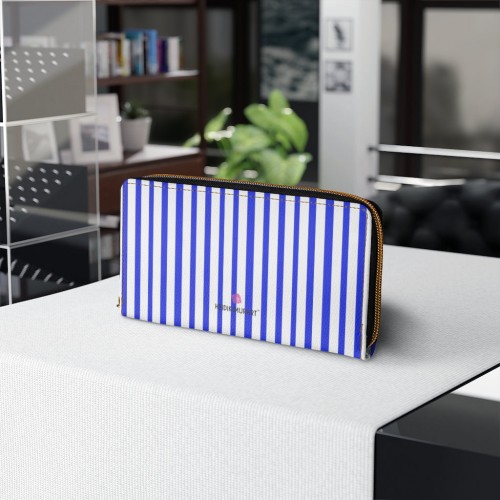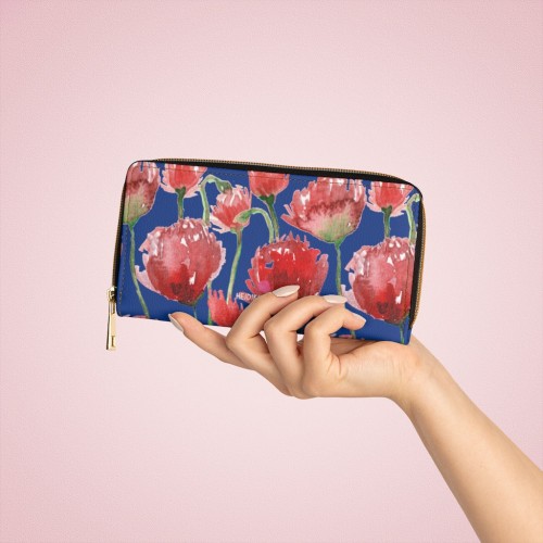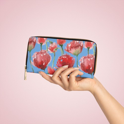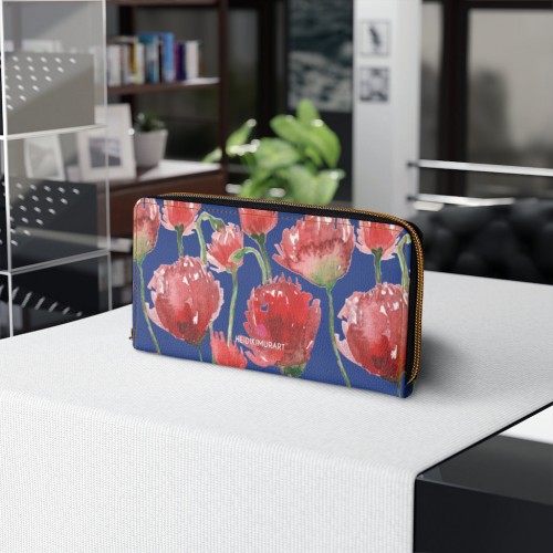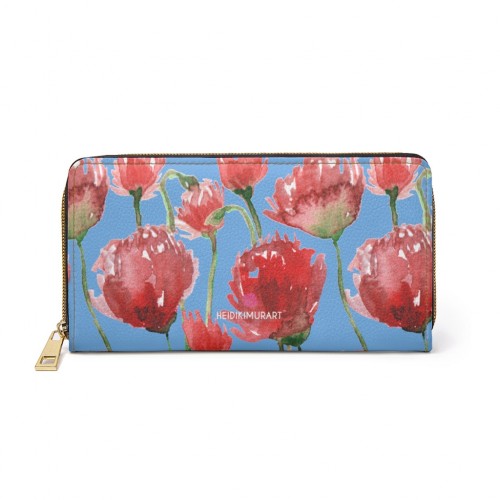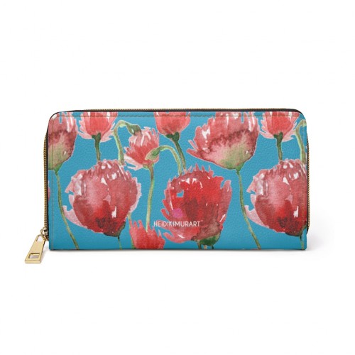 Blue Red Tulips Zipper Wallet, Red Tulips Flower Print Best Long Compact Wallet For Women