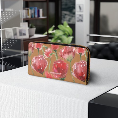 Beige Red Tulips Zipper Wallet, Red Tulips Flower Print Best Long Compact Wallet For Women