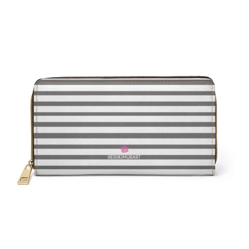 Grey Striped Zipper Wallet, Horizontal Stripes Long Compact Designer Premium Quality Women’s Wallet