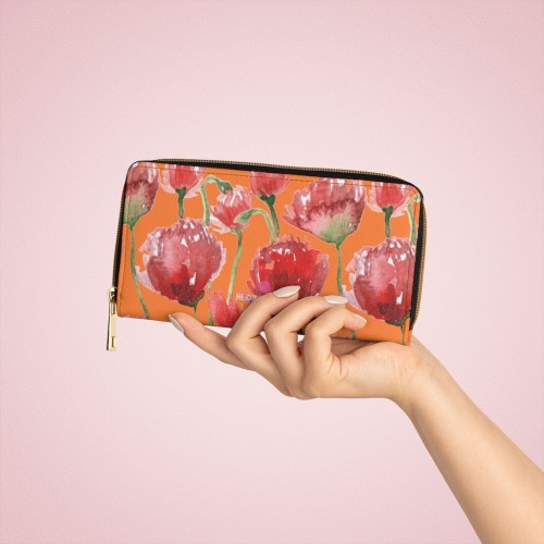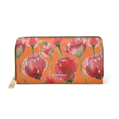 Orange Red Tulips Zipper Wallet, Red Tulips Flower Print Best Long Compact Wallet For Women