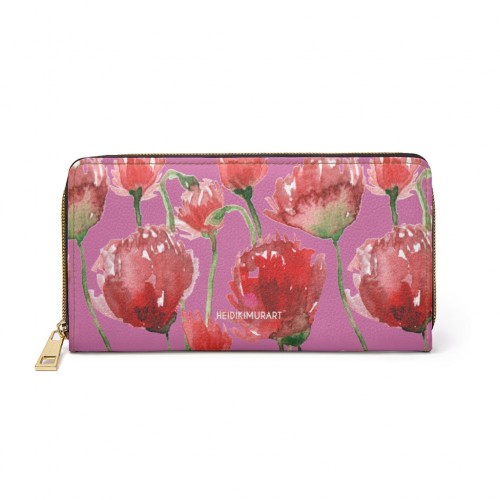 Pink Red Tulips Zipper Wallet, Red Tulips Flower Print Best Long Compact Wallet For Women
