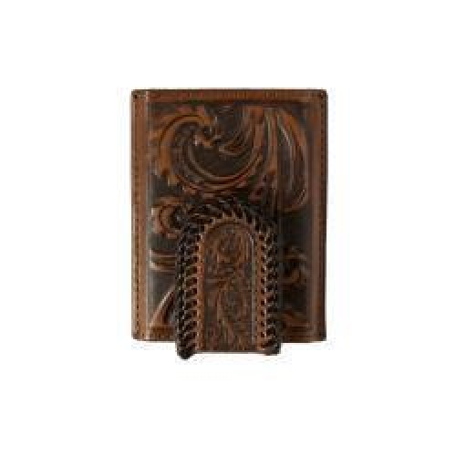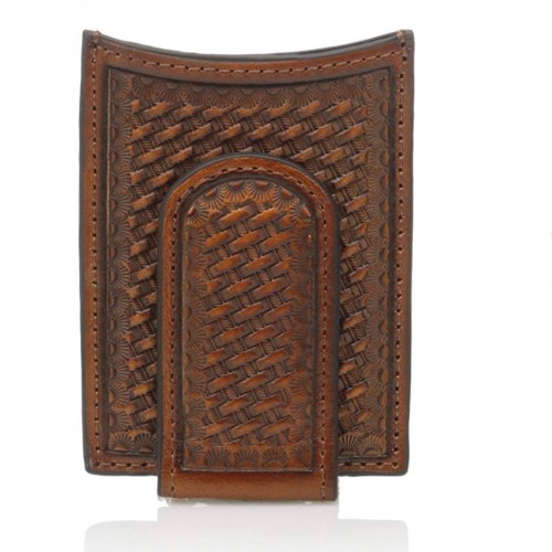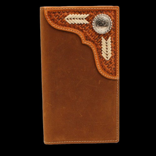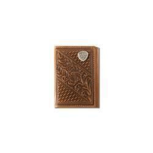 Decorative and stylish men’s 3D rodeo wallet. It is made of genuine leather with hand tooled basket weave and sunburst design. Accented with brown whip lace stitching along the edge. Chestnut interior. Multiple card slots and ID window.
