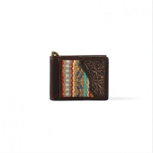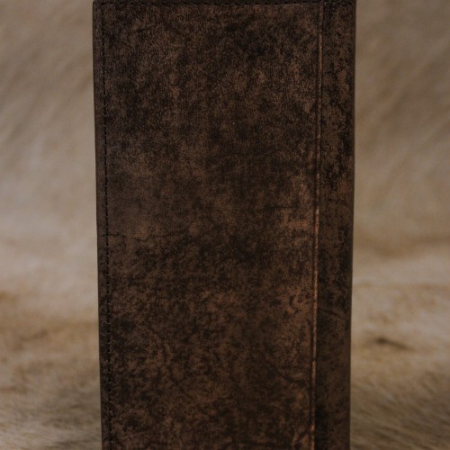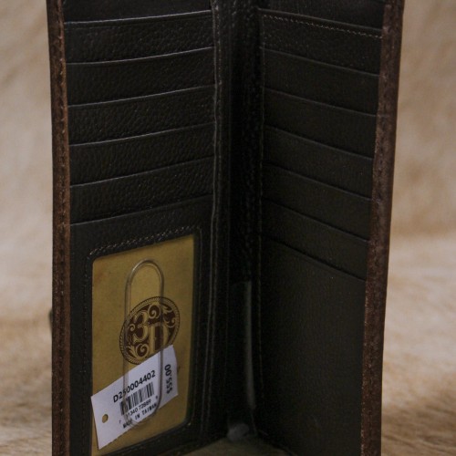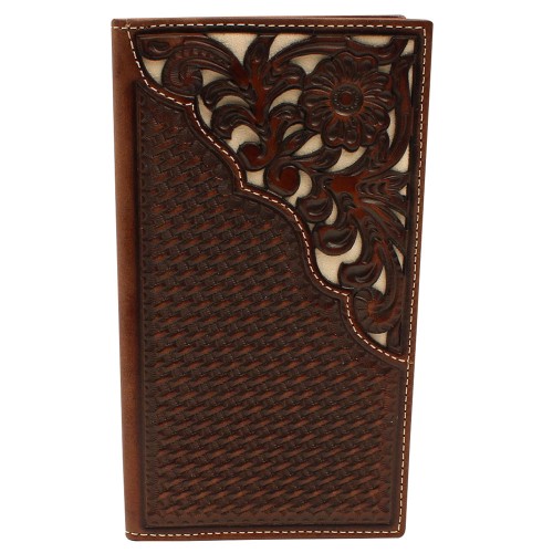 Decorative and stylish men’s 3D rodeo wallet. The body of the wallet has a basket stamped design, with a floral design on the top corner. Multiple slots for cards and a clear ID pocket.