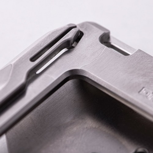 The A10 Adapt Titanium wallet is made of CNC machined Grade 2 Titanium, carefully hand finished and hand assembled in the USA. It is equipped with Dango’s popular and unique patent pending quick release rail mechanism on both sides of the wallet that allows easy access to cards while keeping them securely in place. On one side of the chassis is a horizontal cavity holding up to 4 cards that is protected by a removable titanium RFID plate. On the other side is a single card, vertical oriented cavity meant for displaying identification, badges and any cards that needs scanning; perfect for accessing secured buildings and boarding public transportation.