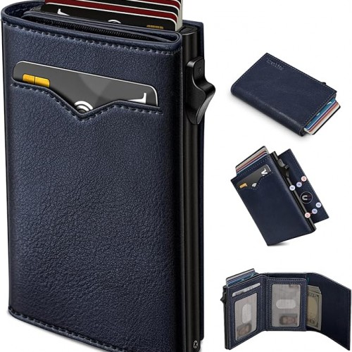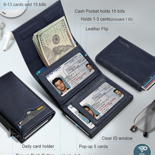 - AMPLE STORAGE–Easy for 9 cards and holds Airtag,Slim wallet with refined layout to fit in front pocket,the money clip with Leather wrapped for carry cash,5 cards in the aluminum case with pop-up access,4 cards in the leather shell;