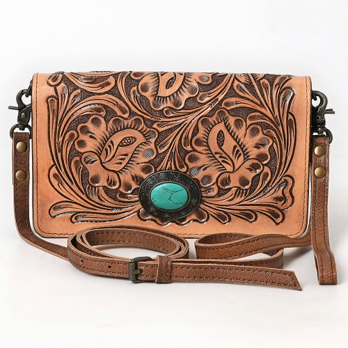 American Darling Organiser Bag Hand Tooled Floral Carved Genuine Leather Western Wallet with Concho and YKK Zipper