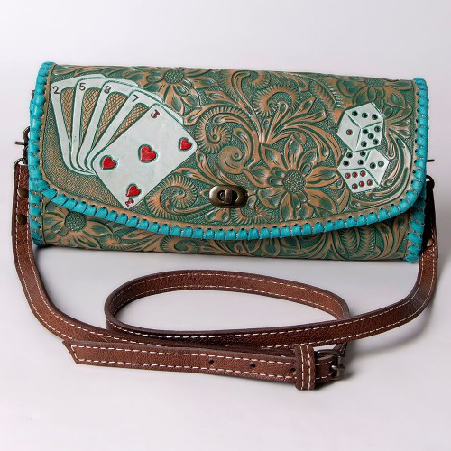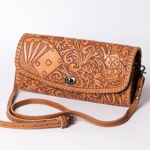 - Featuring intricate floral tooling and a unique playing-card motif, this bag offers Western elegance with practical function. Ideal for everyday wear or travel, it can be carried as a crossbody or elegant clutch.
