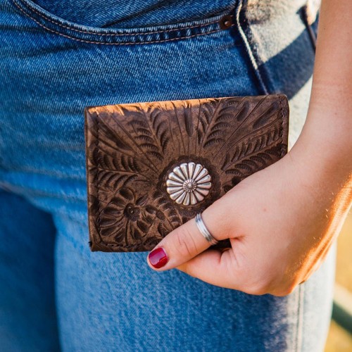 American West Womens Small Concho Distressed Charcoal Leather Trifold Wallet