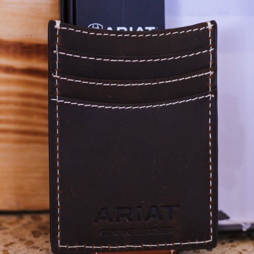 Ariat magnetic money clip by M&F Western Products. Great for when you don’t want to carry a full size wallet. It is made of genuine two tone leather with a basket weave and sunburst embossing and accented with an Ariat logo concho on the clip. Multiple card slots and magnetic clip.