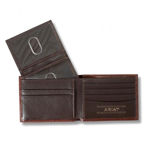 Ariat men’s bifold with pass case wallet by M&F Western Products. This great wallet is made of genuine leather and has a floral embossed front and a removable pass case. Slim fit design with cream color buck lace stitching on the edges. Multiple card slots and an ID window.