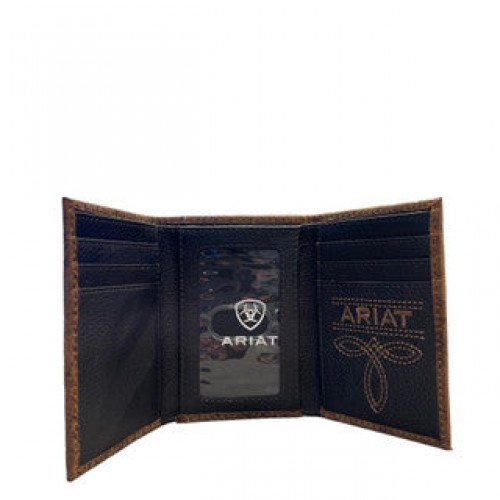 Ariat trifold wallet by M&F Western Products. This great wallet is made of genuine leather with an ostrich pattern and heavy duty stitching. Accented with a tan tab with floral embossing. Slim fit design. Credit card slots and one clear ID pocket for plenty of storage.