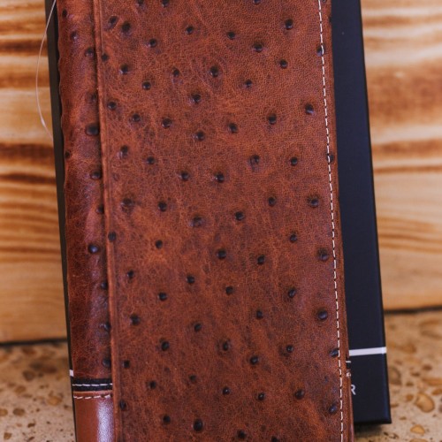 Ariat rodeo wallet by M&F Western Products. This great wallet is made of genuine leather with an ostrich pattern and heavy duty stitching. Accented with a tan tab with floral embossing. Slim fit design. Credit card slots and one clear ID pocket for plenty of storage.