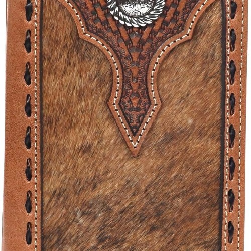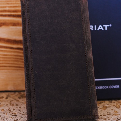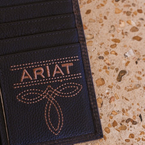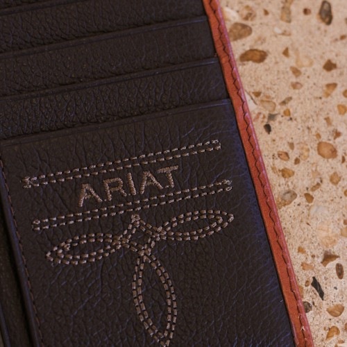 This Ariat rodeo wallet by M&F Western Products is genuine brown crazy horse leather and has Ariat name embroidered in a cream color and Ariat logo outlined in dark brown on the front. Inside are credit card slots and a clear ID pocket.