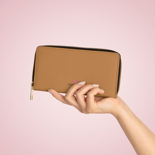 Beige Brown Color Zipper Wallet, Light Brown Solid Color Modern Minimalist 7.87″ x 4.33″ Luxury Cruelty-Free Faux Leather Women’s Wallet & Purses Compact High Quality Nylon Zip & Metal Hardware, Luxury Long Wallet Card Cases For Women