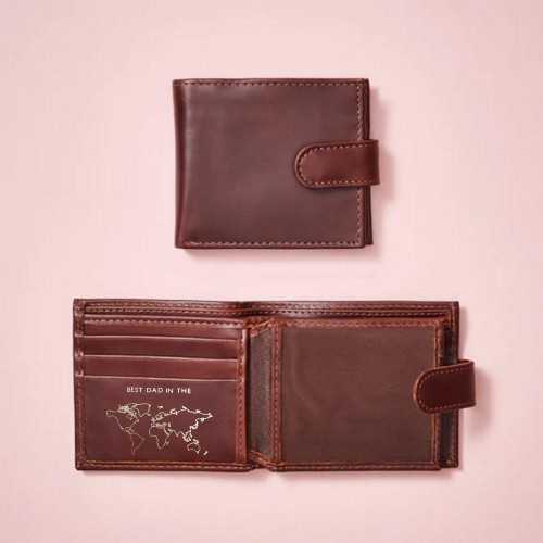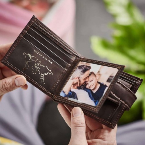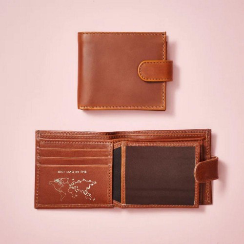 Our best selling Vida Vida handmade trifold wallet makes a wonderful gift for any Dad. This version has a best Dad in the world embossed in gold on inside PLUS you have the option to add his monogrammed initials on the front. The wallet also includes a transparent sleeve to add your own photo or to have one printed by us on a metal card.