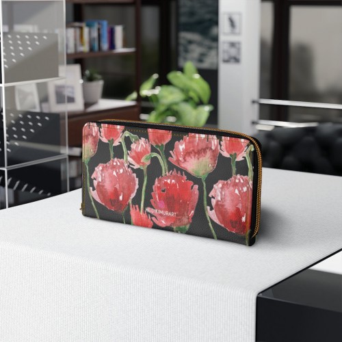 Black Red Tulips Zipper Wallet, Colorful Red Tulips Flower Print Best Long Compact Cruelty Free Faux Leather High Quality Cardholders Wallet For Women, One Size 7.9″x4.3″x.98″