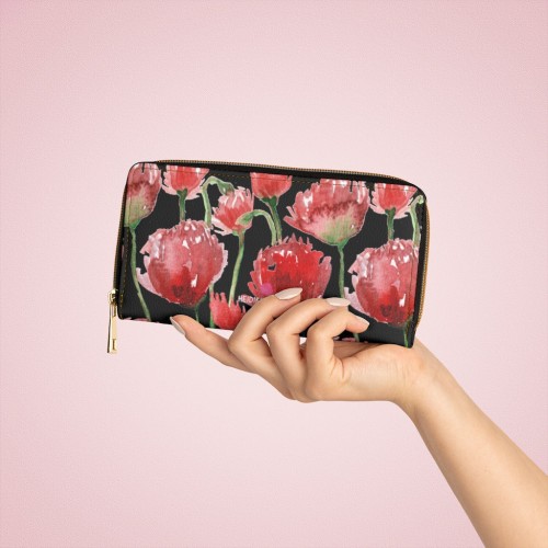 Check out these designer black and red floral flower tulips print women’s long wallets for your every day use. For carrying around all your credit cards, cash, and driver’s licenses look no further than this long and compact floral print women’s wallet. Made with high quality cruelty-free faux leather, this chic women’s long designer wallet comes packed with practicality and style. This is a well designer women’s wallet that is rather safe to hold your valuable cash/ credit cards/ cards while you are on the go. Order these women’s zipper wallets today while our limited supplies last, we ship internationally to most countries worldwide. These brand new designer women’s wallets are made-to-order just for you.