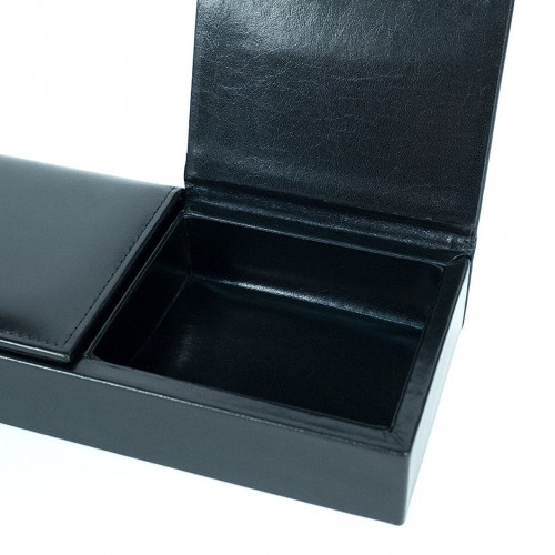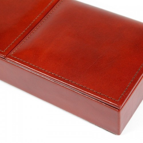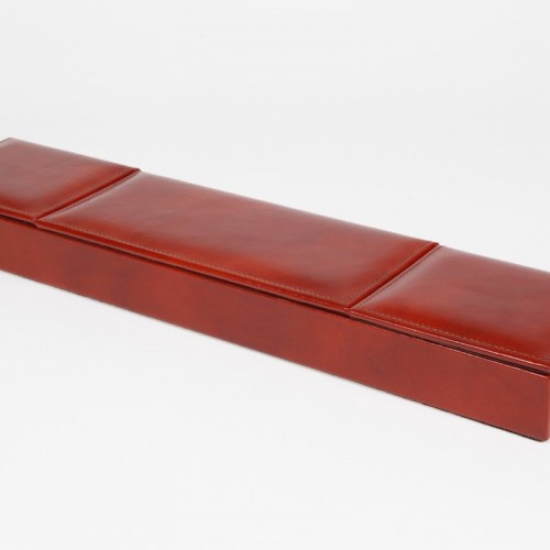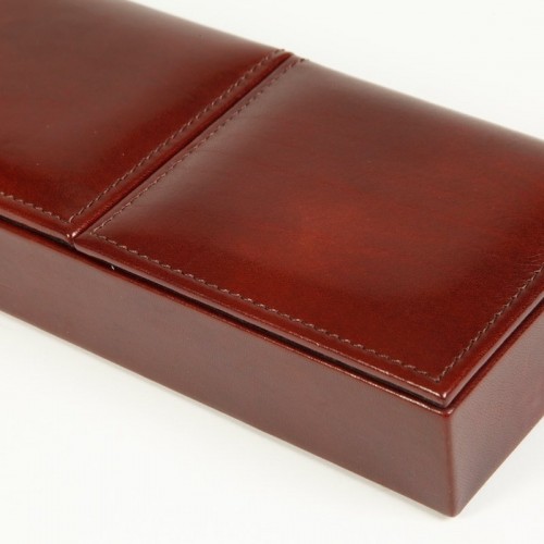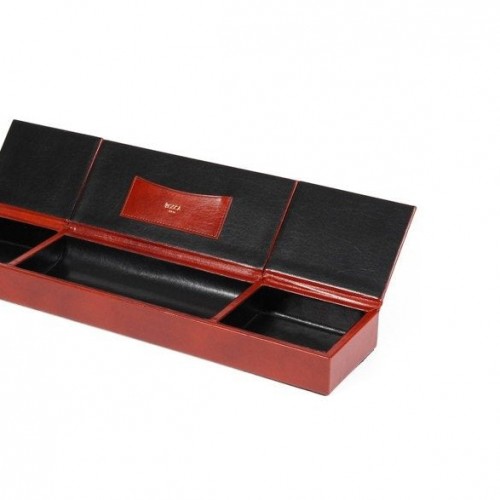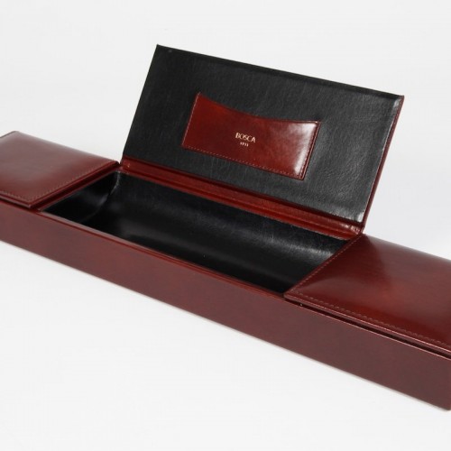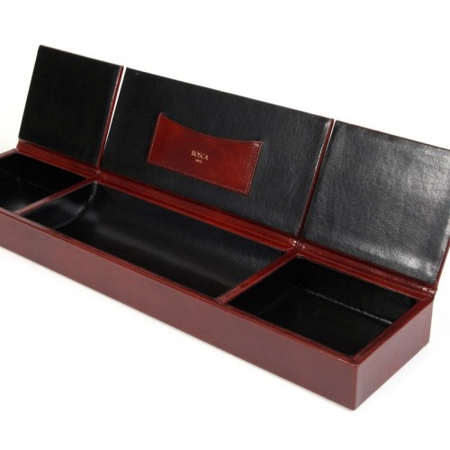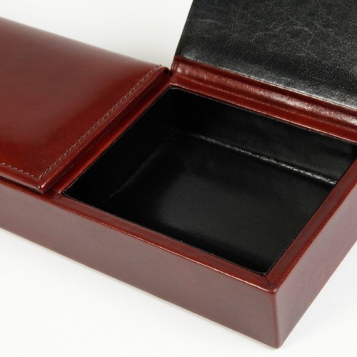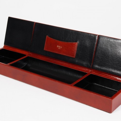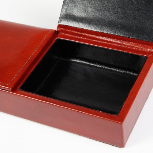 Color:Amber How clever. All those little doodads off of your desk “ out of thevarious drawers “ and in one place where you can find them. This unique piecehas three compartments with flip-up covers for business cards, paper clips,rubber bands, band-aids, that key that you know goes to something, but your’enot sure what… out of sight, but not out of mind. Also looks gorgeous on adresser top to keep all your shiny things in one place. Old Leather by Boscais a hand-stained Italian leather.