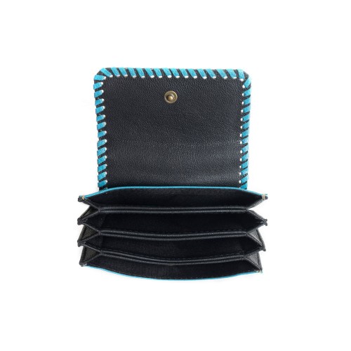 Brighten up your Western style with this elegant Myra wallet that blends bold color with fine craftsmanship. It features luxurious hairon leather over vivid blue genuine leather, accented by intricate whipstitch detailing. Compact yet spacious, it offers multiple card slots and RFID protection for secure storage. Whether you’re off to a rodeo, exploring the ranch, or dancing at a concert/carnival, this charming accessory is a must-have for every cowgirl embracing the flair of the Southern West.