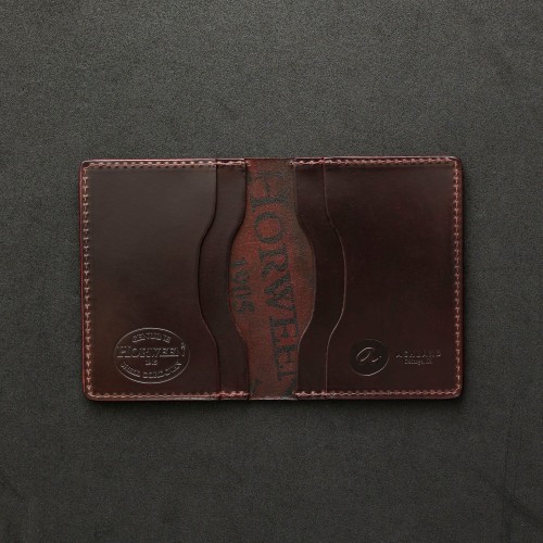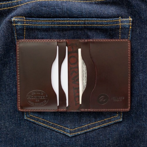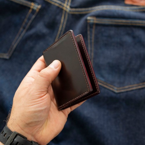 The Bugs Moran is a sleek shell cordovan wallet crafted for minimalism, suitable for carrying in either front or back pockets. Its streamlined design omits a dedicated bill compartment, yet it accommodates folded cash within the two larger card slots, maintaining a slim and efficient profile.