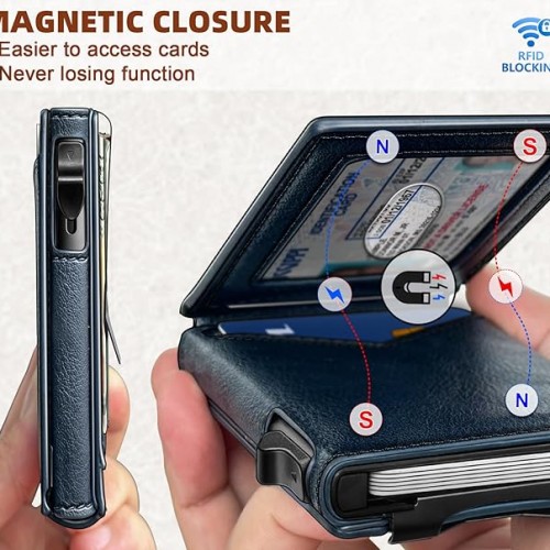- CAPACITY-Pop-up metal Case in flipping leather shell,9 card slots (including 1 ID window) and metal money clip for couple of bills;