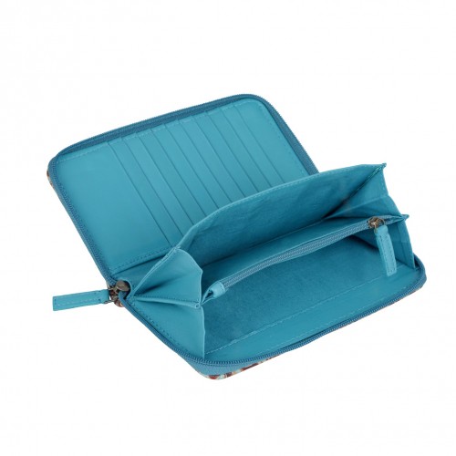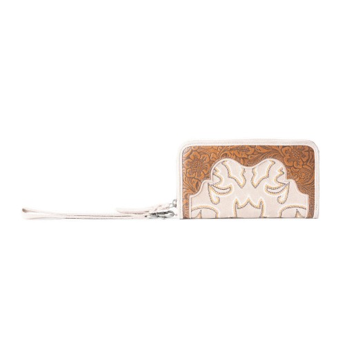 Make a statement with this bold and fearless Western clutch wallet, inspired by the untamed beauty of nature. Its striking color combination ensures it stands out, making it a must-have for trendsetters. Crafted from genuine leather, this embossed and rug-accented wallet blends artistry with durability. Designed for practicality, it features an RFID protector, an inside zipper pocket, and credit card compartments, making it the perfect cowgirl clutch for any adventure.