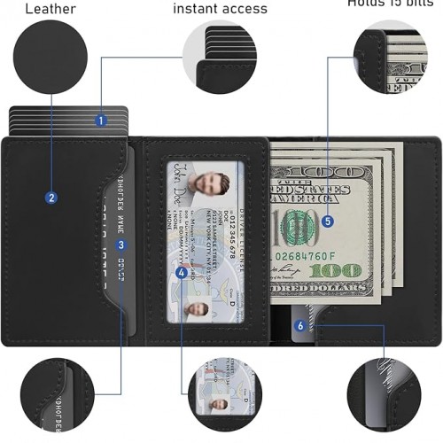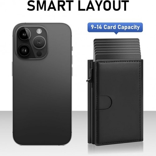 Business Card Holder Leather Wallets for Men Rfid Blocking Wallet Front Pocket Pop Up Aluminum Case Black Card Cases with 1 ID Window