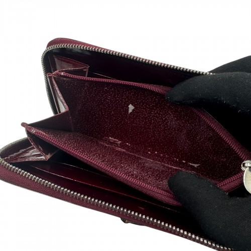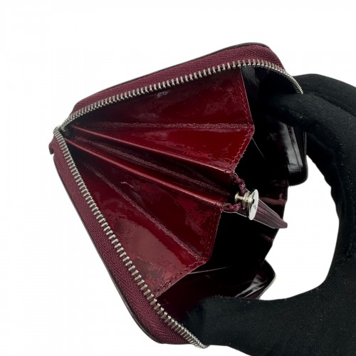 Elegant Cartier wallet crafted from glossy Bordeaux patent leather. Features a silver-tone Cartier “C” logo, zip-around closure, multiple card slots, a central zip coin pocket, and spacious compartments for bills and receipts. A refined piece combining functionality and timeless luxury.