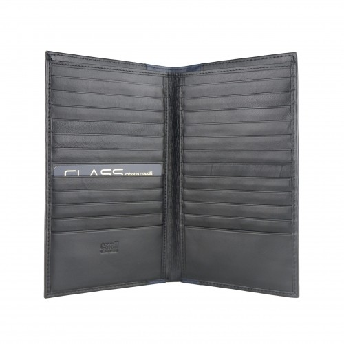 Experience the epitome of sophistication with this Cavalli Class wallet, crafted from 100% calfskin leather. Featuring a tasteful blend of blue and black hues, the wallet offers convenient card holders on both sides, ensuring style meets practicality for the discerning gentleman.