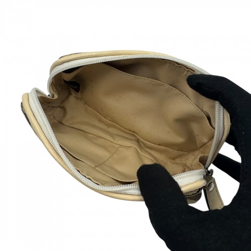 Elegant Coach cosmetic pouch crafted in signature jacquard canvas with beige leather trim and gold-tone hardware.