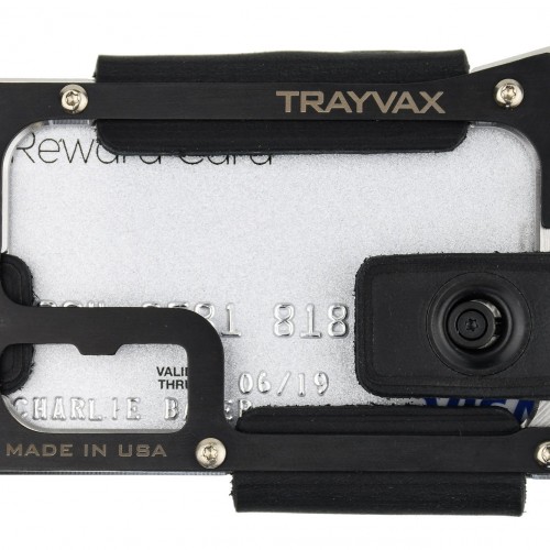 The wallet is sourced and made in the USA, backed by the Trayvax 65-year Heirloom Warranty. US Patent No D798,591.