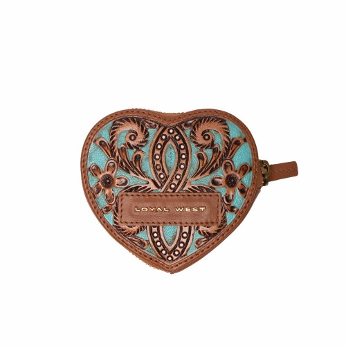The Cupid Coin Pouch is a beautifully crafted accessory, made from premium tan & turq color hand-tooled calfskin. Shaped like a heart, it features a full handtooled design that adds an intricate, artisanal touch to this small coin purse or wallet. Perfect for carrying coins, cards, or small essentials, its compact size makes it both functional and charming. The heart-shaped design and hand tooled details make it a standout piece, adding a unique, handcrafted elegance to your everyday essentials.