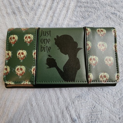 Awesome Danielle Nicole Disney Snow White with Poison Apple Wallet. It has a snap closure with slots for credit cards and a ID slot. There is also a large slot for bills and a zipper pocket for coins.