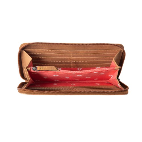 This zip-around women’s wallet features a striking Southwestern-inspired print in navy and cream with geometric diamond patterns. The ample full-size design accommodates cards, cash, and coins with multiple interior compartments. Accented by rich tan leather trim, and includes a matching leather detachable wrist strap. Lovely!