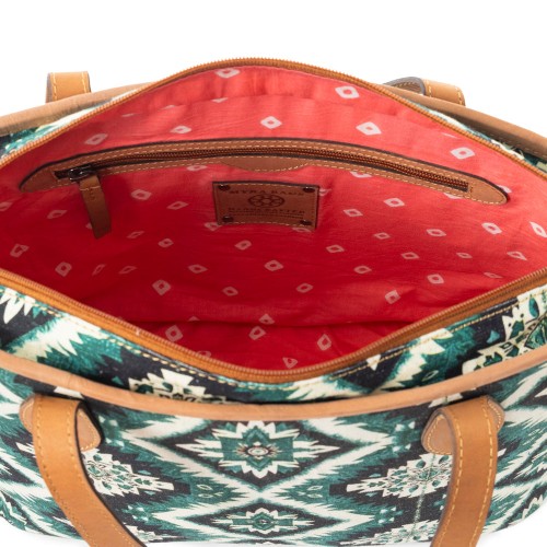 Step into bold elegance with the Desert Dream Duo, a stunning combo that brings together tribal-inspired charm and everyday functionality. This matching set includes the Desert Sky Star Tote Bag in Turquoise and the Desert Diamond Wallet in Green, both crafted from upcycled canvas with rich tan leather accents.