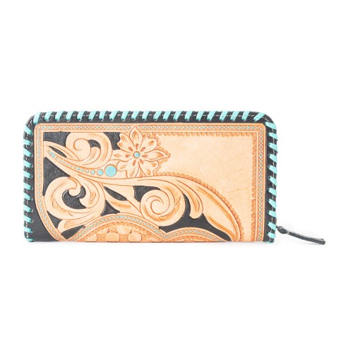 Dare to dazzle with our Diaphanous wallet. It exdues radiance because of the floral pattern carved on the front panel. The blue stitching detail stands out against the front panel and gives it a unique look.