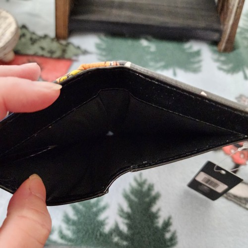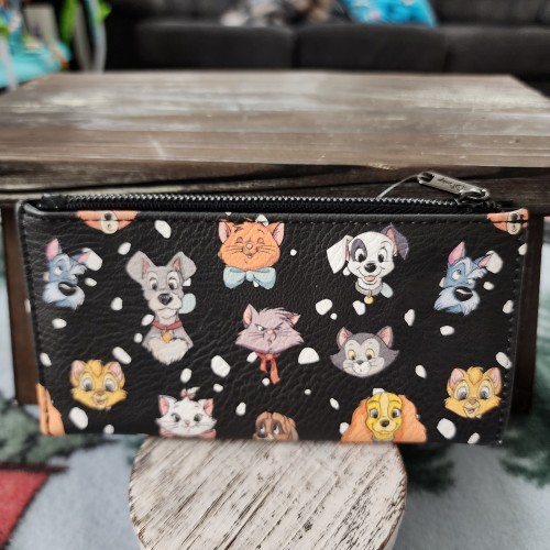 Awesome Disney Dogs & Cats Movie Characters wallet. It has a snap closure with slots for credit cards and a ID slot. There is also a large slot for bills and a zipper pocket for coins.