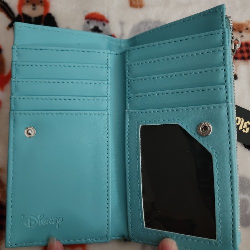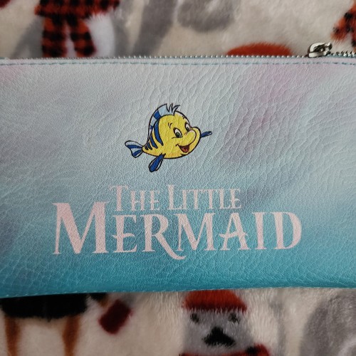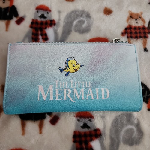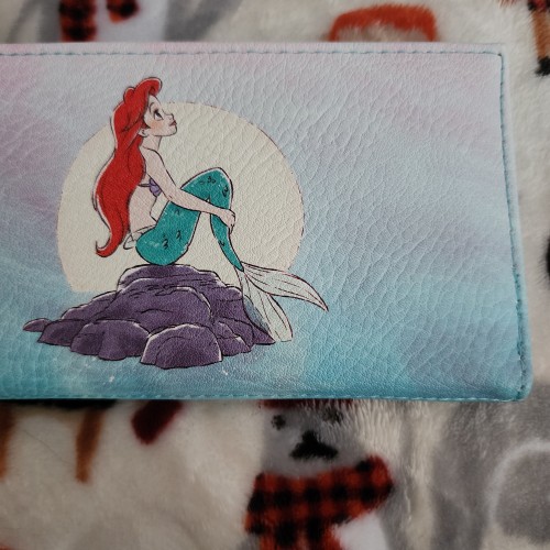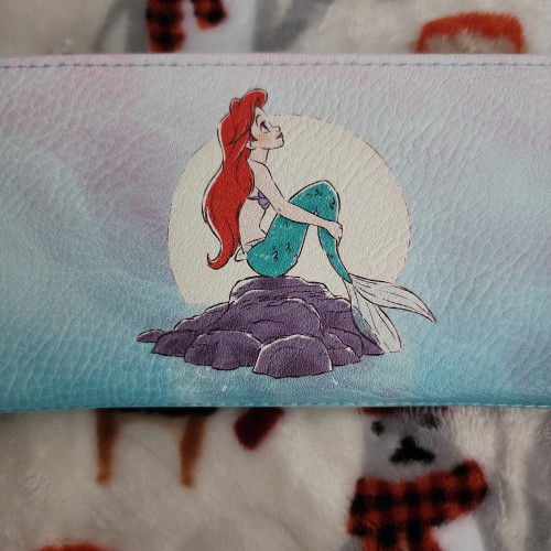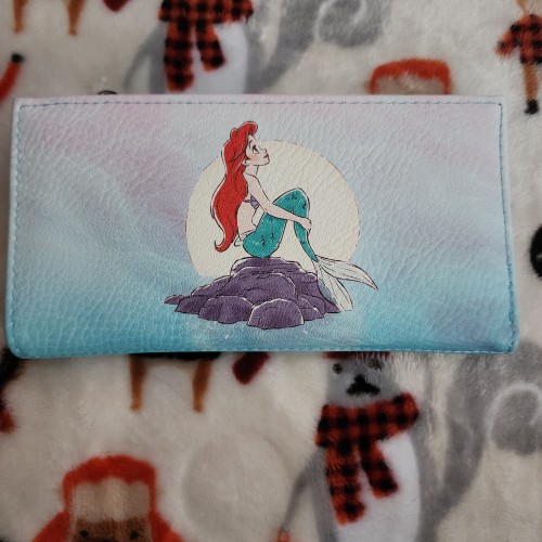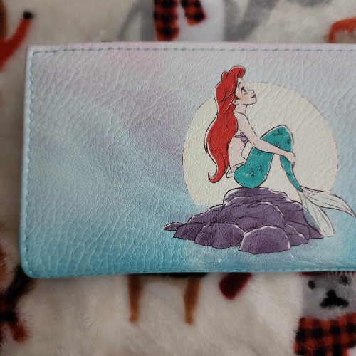 Awesome Disney Little Mermaid Ariel on Rocks Wallet. This wallet has a snap closure with slots for credit cards and an ID slot. There is a large side compartment for bills. Great for everyday use.
