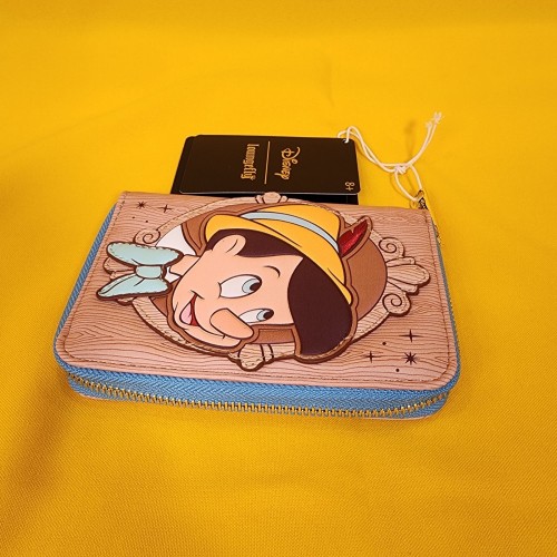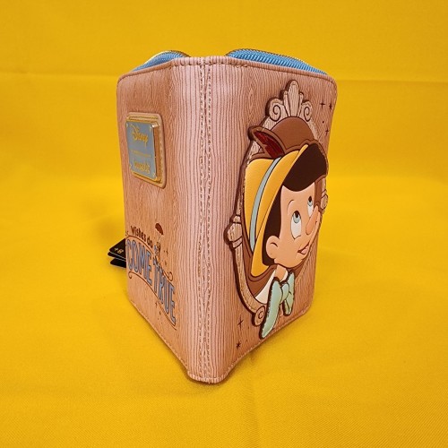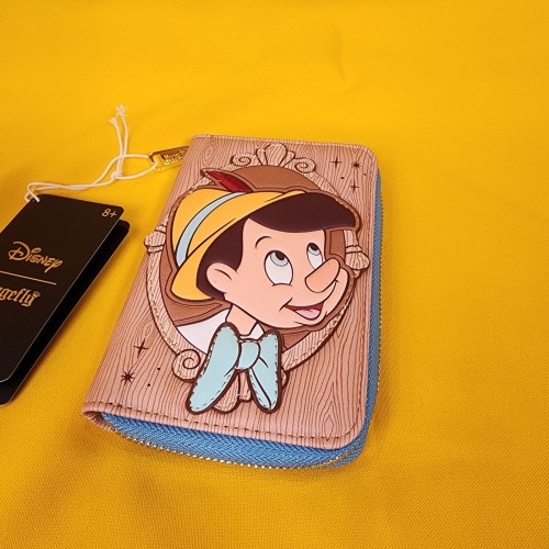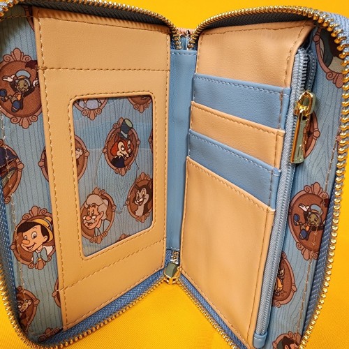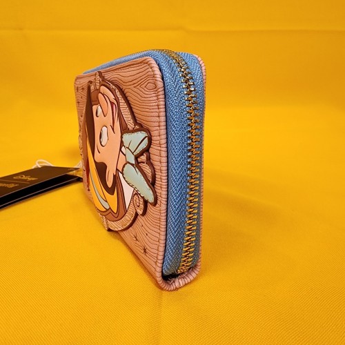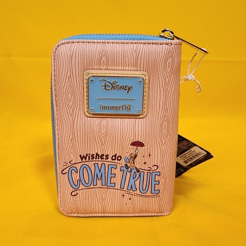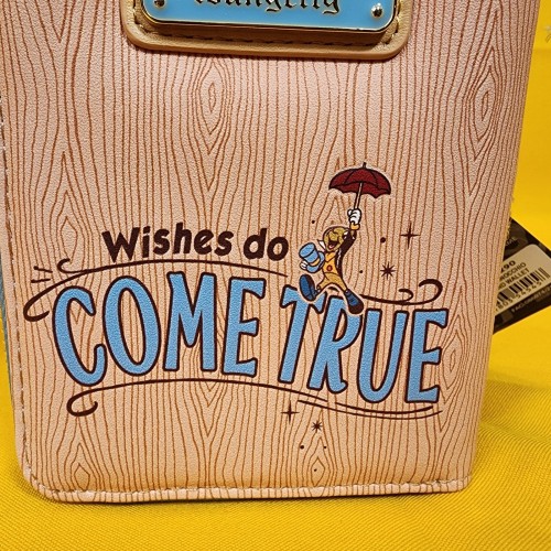 This wallet features Pinocchio in a cameo frame on the front. The back has the words “Wishes Do Come True.” Debossing gives the wallet a woodgrain-like texture and look. Inside, there are four card slots and one clear slot for an ID.