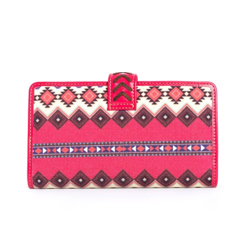 Elevate your style with the Empress Pointe Deluxe Wallet, a perfect blend of artisanal craftsmanship and bold Southwestern flair. Featuring vibrant Aztec weaving on upcycled canvas, this cowgirl wallet is beautifully accented with rich leather trim in empress pink. Thoughtfully designed with an RFID protector, multiple credit card compartments, a phone slot, and an interior zipper pocket, this ladies western wallet combines functionality with rustic charm. The snap-close front flap ensures your essentials stay secure, making it a versatile accessory for both the ranch and city life.
