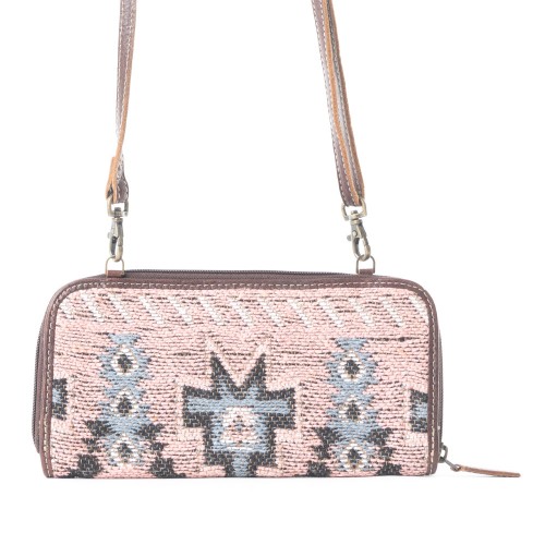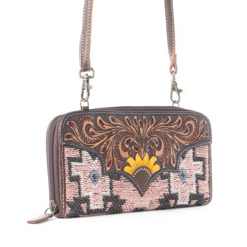 Travel light without compromising style with the Funky Boho Wallet. Featuring a unique mix of hand tooled leather and rug fabric, this Myra wallet exudes a free-spirited, Western vibe. The adjustable shoulder strap makes it easy to wear as a crossbody bag, while the inside credit card compartments and zipper pocket keep your items organized. With RFID protection, this cowgirl wallet is both fashionable and functional for the modern woman.