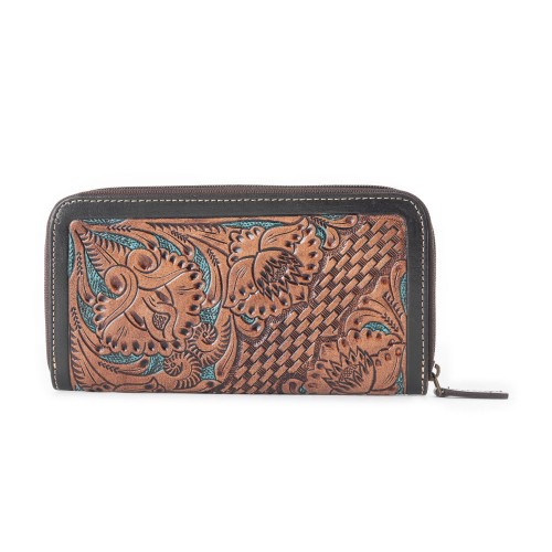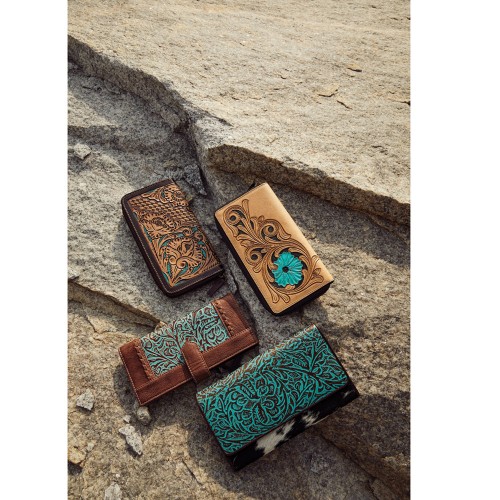 For those who appreciate artisanal craftsmanship, this Myra wallet is a perfect choice. This tooled leather wallet featuring intricate hand tooled detailing and vibrant patterns is both expressive and timeless. Designed for practicality, it comes with an RFID protector, an inside zippered pocket, and a well-organized credit card compartment. Whether you’re heading to a rodeo, a casual outing, or a night on the town, this western wallet adds a touch of charm and individuality to any look.