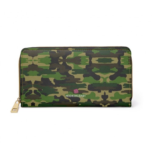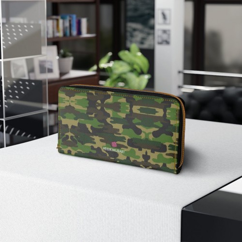 Green Camo Zipper Wallet, Camouflage Army Military Print Long Compact Designer Premium Quality Women’s Wallet