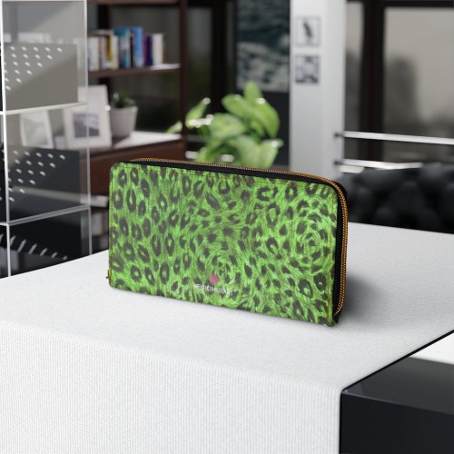 Green Leopard Print Zipper Wallet, Animal Print Long Compact Designer Premium Quality Women’s Wallet