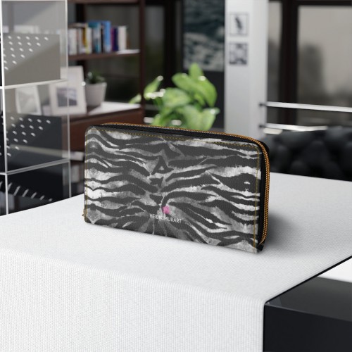 Grey Tiger Striped Zipper Wallet, Best Tiger Stripes Animal Print Long Compact Designer Wallet For Women